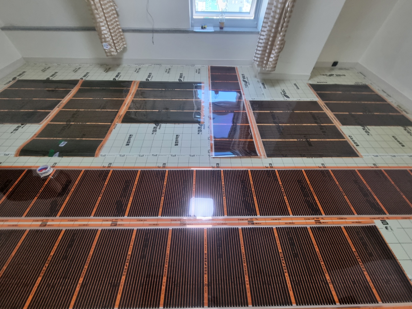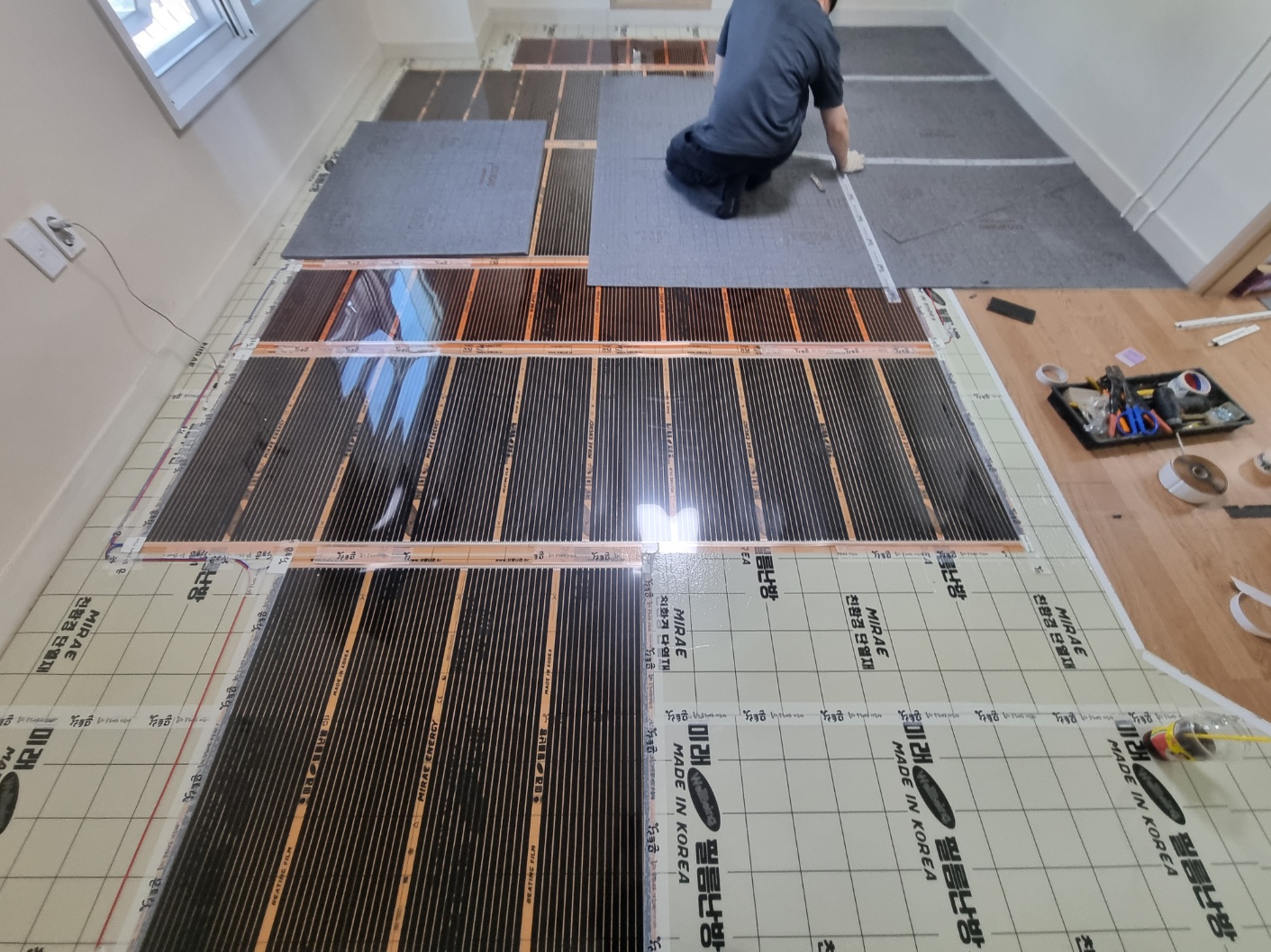 난방필름을 배치, 배치된 난방필름에 결선작업을 하였습니다.
